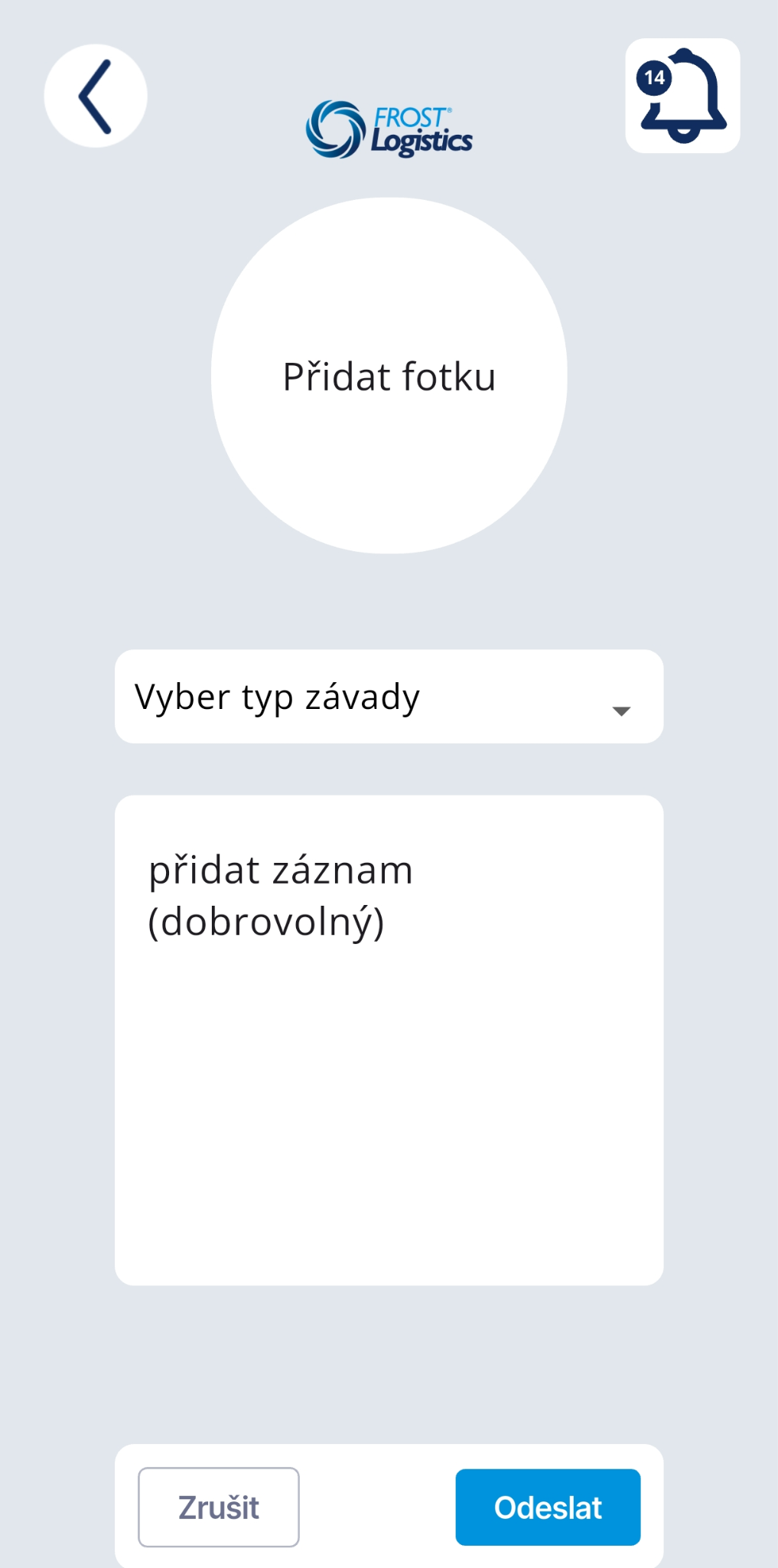 Klikněte na tlačítko Přidat fotku, pokud je potřeba povolit práva, povolte je a vyfoťte závadu. V roletce vyberte typ závady a ideálně napište popis závady. Závadu uložíte tlačítkem Odeslat.
