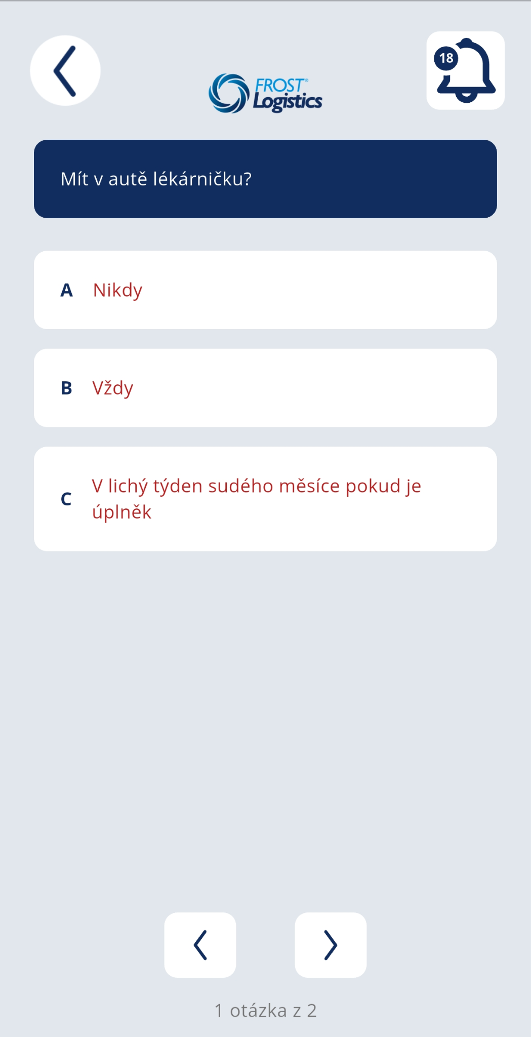 Odpověď, kterou považujete správnou vyberete kliknutím na ní. Na další nebo přechozí otázku se posouváte šipakmi v dolí části obrazovky.