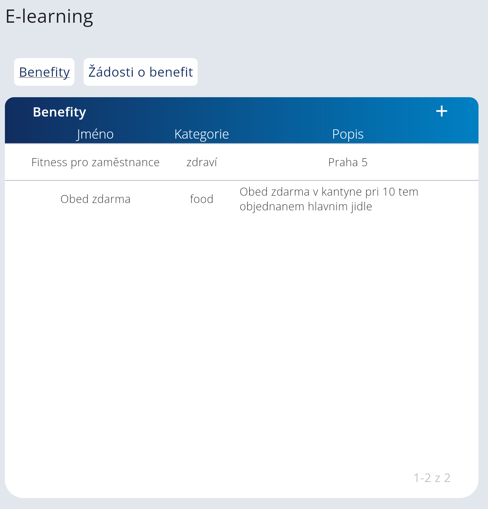 Na obrázku vidíte seznam benefitů a v levém horním rohu můžete přepnout na žádosti o benefity. V pravém horním rohu tabulky můžete vytvořit nový benefit. Kliknutím na konkrétní řádek můžete změnit konkrétní benefit.