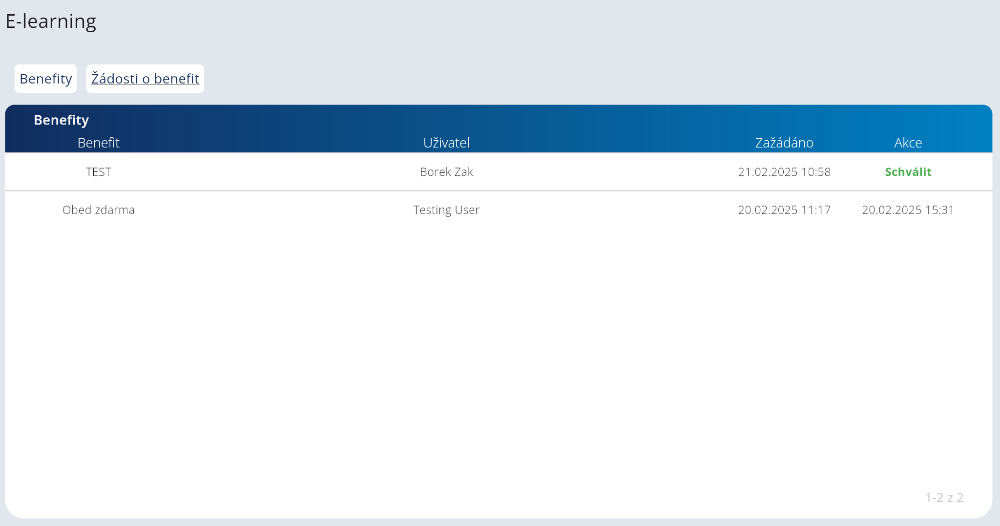 Na obrázku vidíte žádosti o benefity. Kliknutím na tlačítko Schválit akceptujete uživateli jeho žádost o benefit.