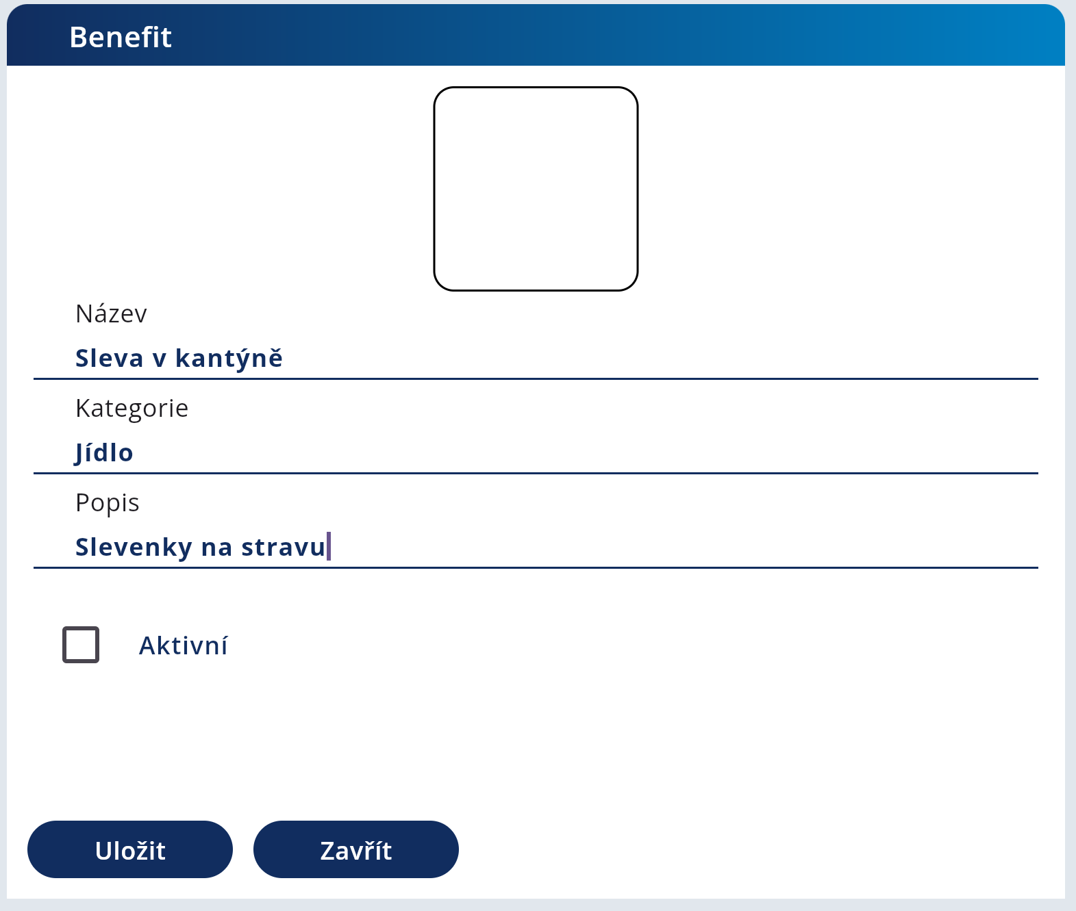 Na obrázku vidíte formulář pro vytvoření nového nebo editaci stávajícího benefitu. Kliknutím na rámeček můžete přidat fotografii. Po vyplnění políček formulář uložíte tlačítkem Uložit.