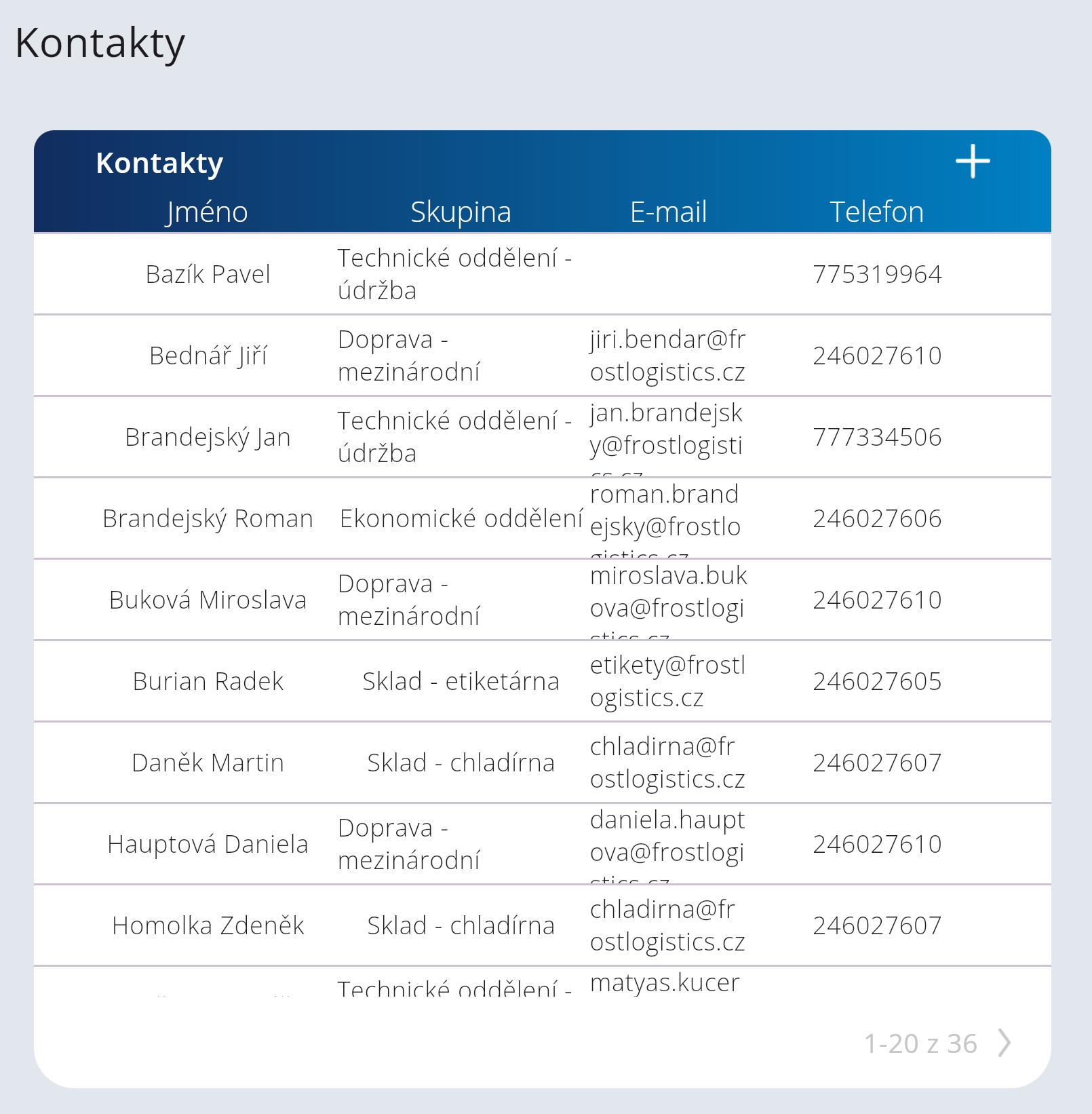 Na obrázku je seznam kontaktů. Jedná se jak o interní zaměstnance firmy, tak i o externisty. V pravém horním rohu můžete kliknout na tlačítko PLUS, kterým vytvoříte nový kontakt.