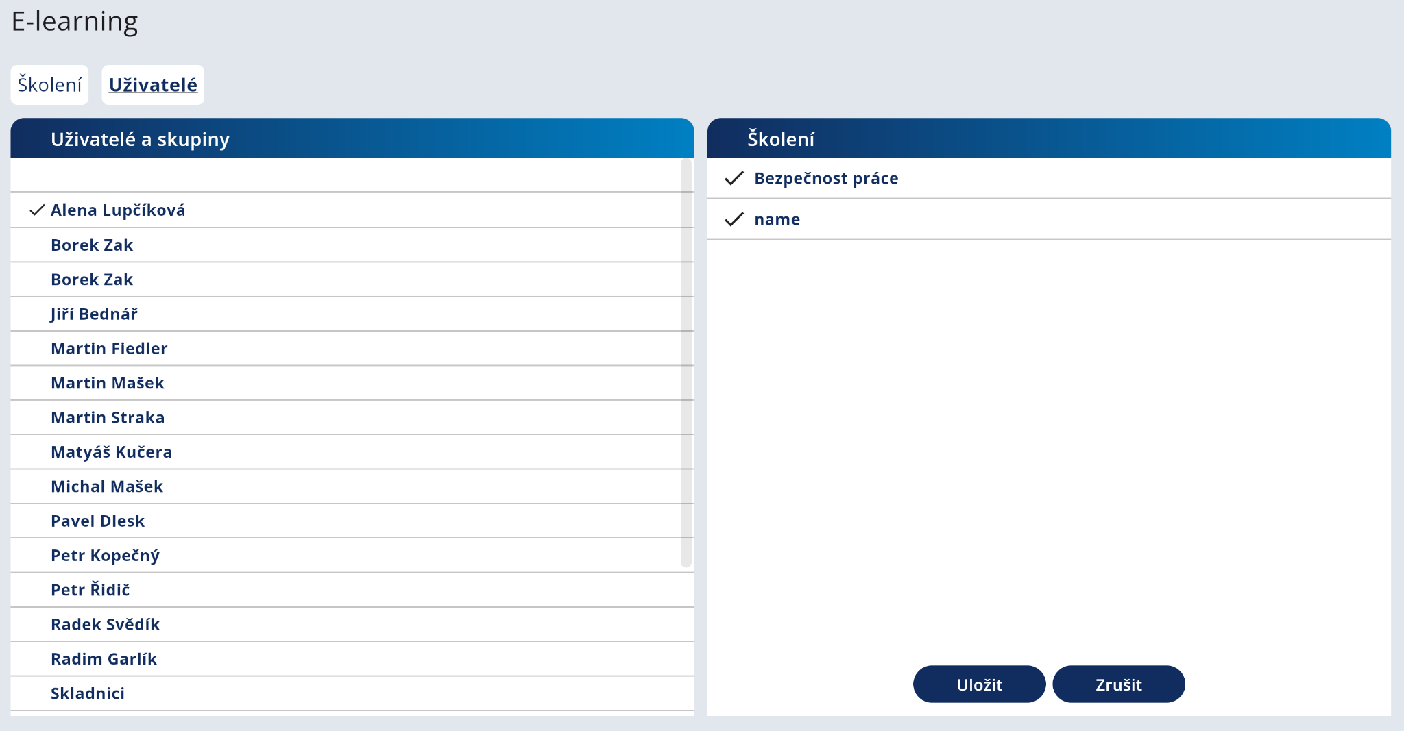 Kliknutím v levé půlce obrazovky na jméno vyberete uživatele nebo skupinu, kterému chcete přiřadit školení. V pravé půlce obrazovky vybranému uživateli nebo skupině přiřazujete konkrétní školení. Pokud je uživatel/skupina nebo školení vybrán, zobrazí se symbol “fajfky”. Tlačítkem Uložit uložíte provedené změny. Změny ukládejte pro každého uživatele či skupinu zvlášť.