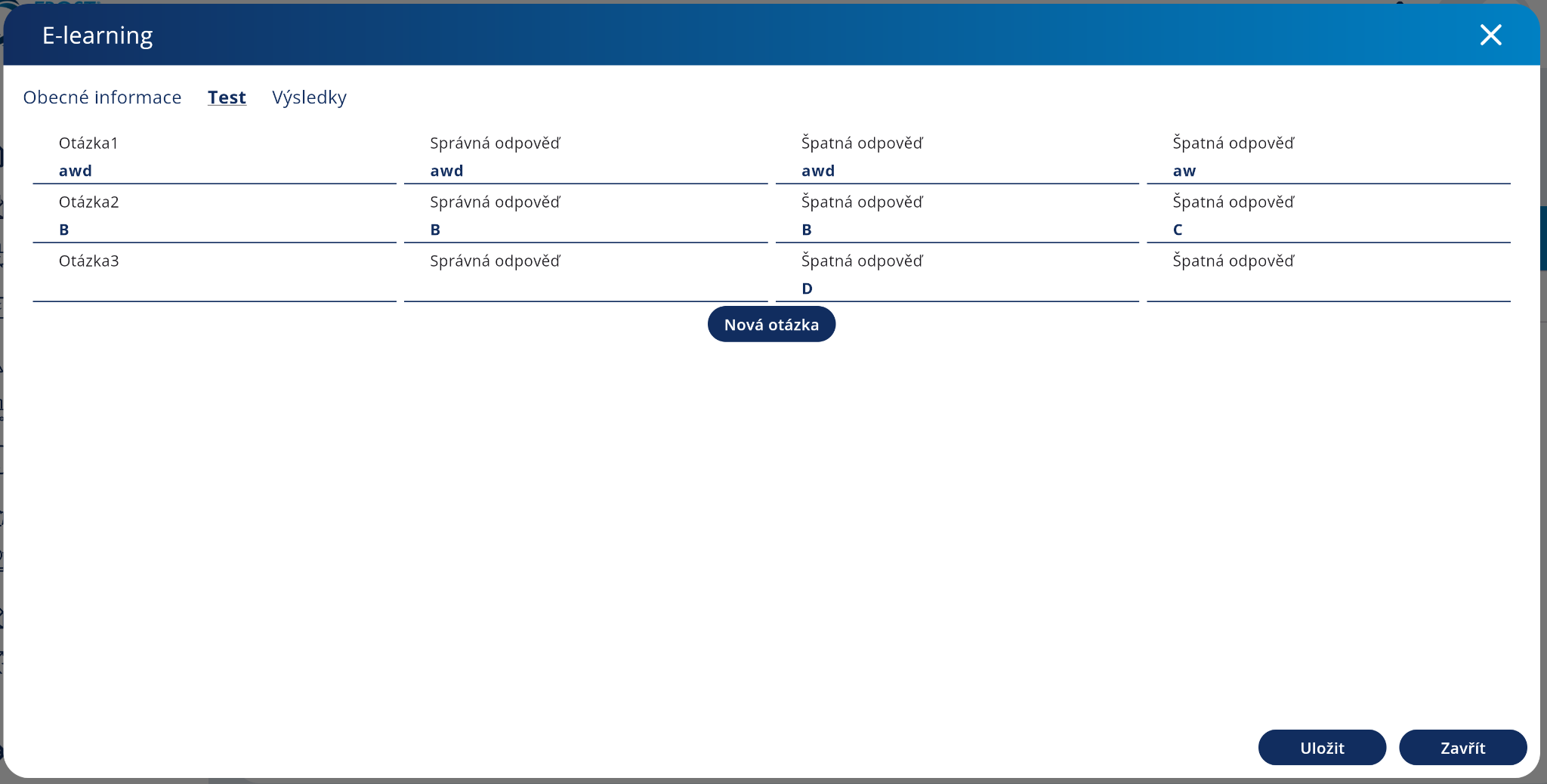 Kliknutím na tlačítko Nová otázka můžete přidat novou otázku a vyplnit jí jednu dobrou a dvě špatné odpovědi.