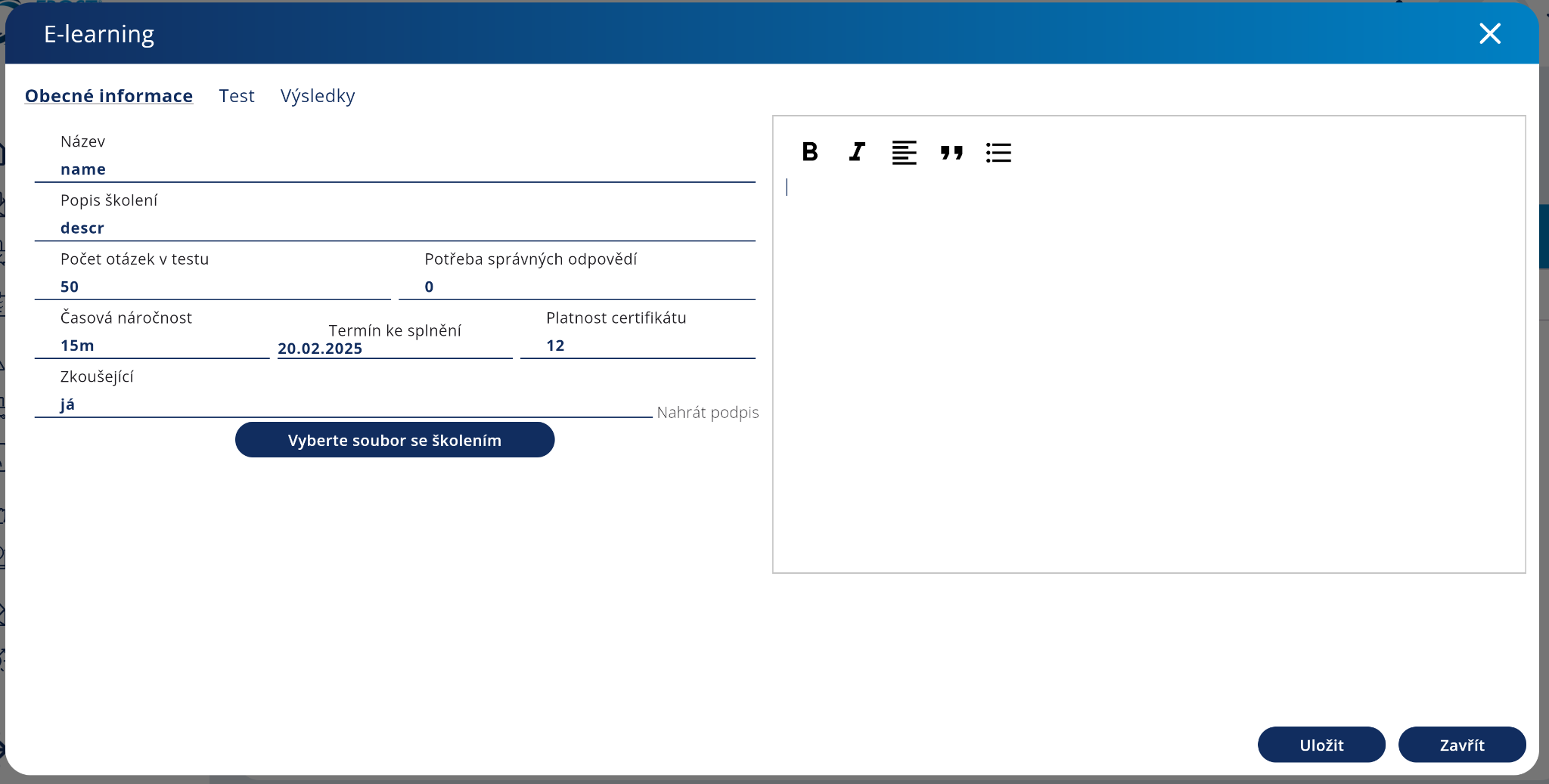Okno pod záhlavím má ještě tři záložky Obecné informace, Test a Výsledky. Všechny změny můžete kdykoliv uložit tlačítkem Uložit. Není potřeba ukládat zvlášť obecné informace a poté například test.