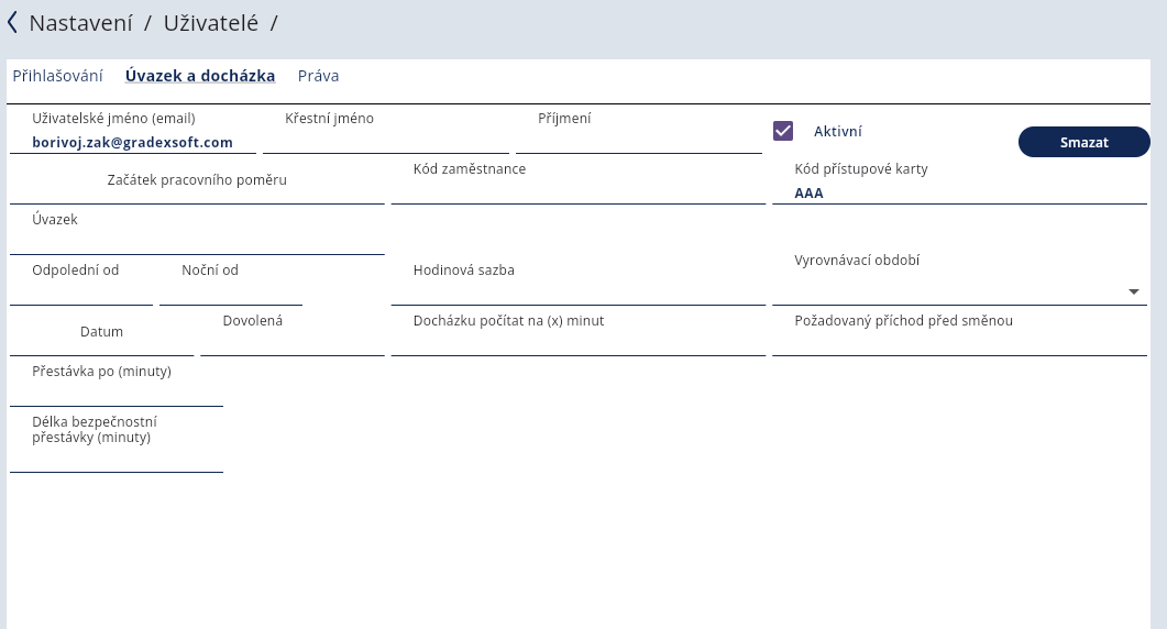 V této záložce najdeme nastavení uživatele a jeho údaje pro výpočet docházky.